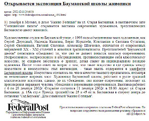 Выставка работает с 6 по 28 декабря 2002г. Открытие состоится 11 декабря 2002г. в 18.00. Адрес: ул. Старая Басманная. д. 15А стр.4 Проезд: троллейбусы 25 и 45 от м. Бауманская в сторону центра до остановки "Сад Баумана". Дом с вывеской "Казино Голицын".